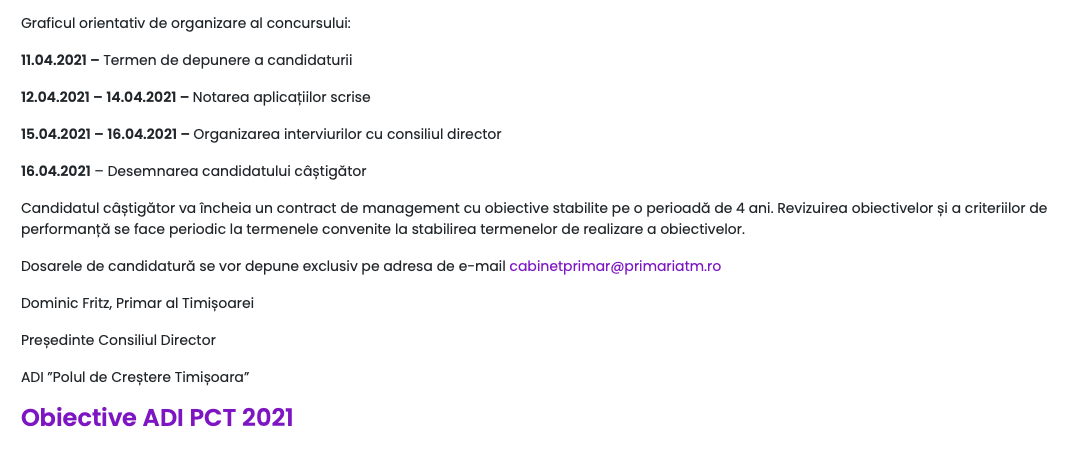 Vă reamintim, PMT și ADI făceau public, în martie, că Asociația de Dezvoltare Intercomunitară „Polul de Creștere Timișoara” caută un director general. Candidaturi s-au putut depune până în 11 aprilie, „exclusiv pe adresa de e-mail cabinetprimar@primariatm.ro”, pentru ca până în 14 aprilie să se facă „notarea aplicațiilor scrise”, iar până în 16 să fie organizat interviul și în 16 aprilie să fie desemnat candidatul câștigător.