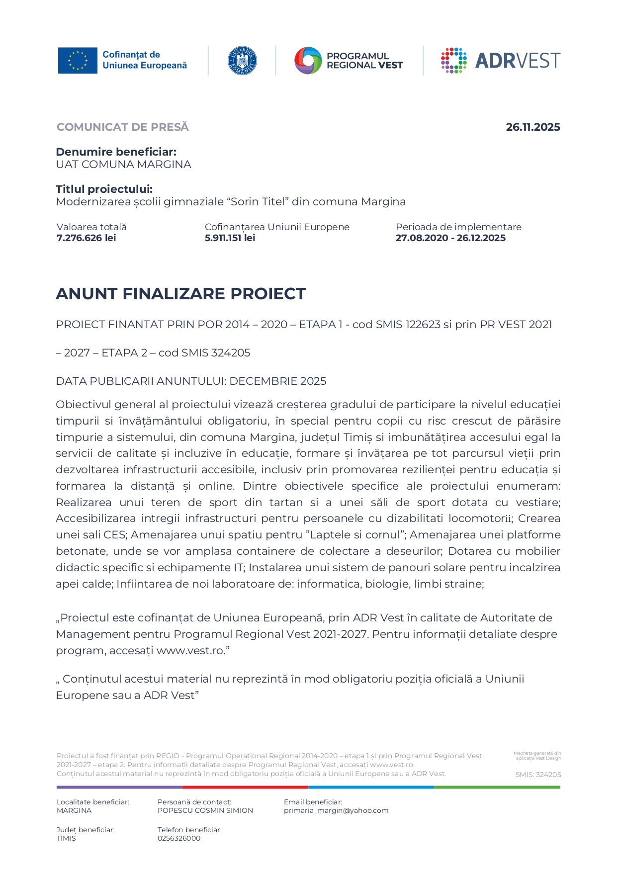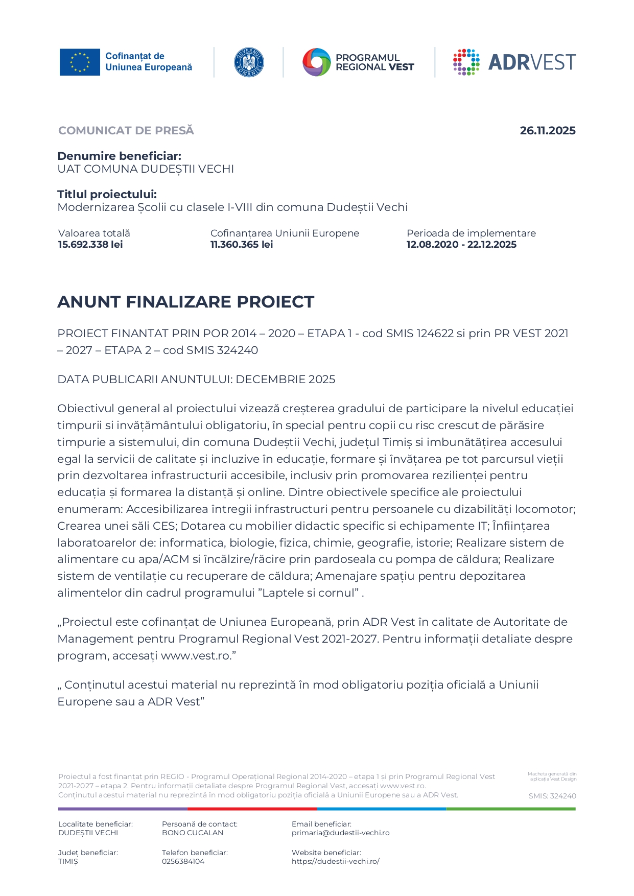 Primăria Comunei Moșnița Nouă a anunțat că 3 decembrie este data deschiderii noii grădinițe din Moșnița Veche, moment care marchează o etapă importantă pentru comunitate. Tot atunci vor deveni funcționale și locurile suplimentare create la grădinița din Urseni, contribuind la rezolvarea deficitului major de spații educaționale pentru preșcolari.