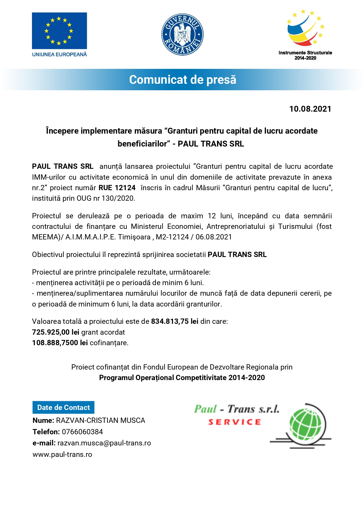PAUL TRANS SRL anunță lansarea proiectului ”Granturi pentru capital de lucru acordate IMM-urilor cu activitate economică în unul din domeniile de activitate prevazute în anexa nr.2” proiect număr RUE 12124 înscris în cadrul Măsurii ”Granturi pentru capital de lucru”, instituită prin OUG nr 130/2020.