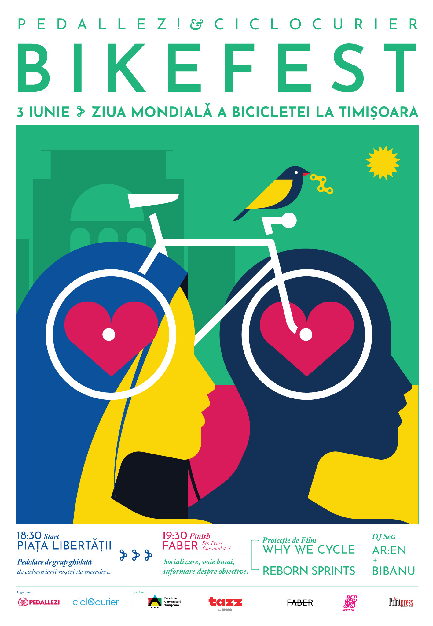 Ora 18:30 – Start: Piața Libertății: pedalare de grup ghidată de ciclocurieri. Finish: FABER (Spl. Peneș Curcanul 4-5). Apoi începe evenimentul velo-cultural la FABER. Între 19:30 – 21 are loc campionat de sprint. Participanții se vor întrece doi câte doi.