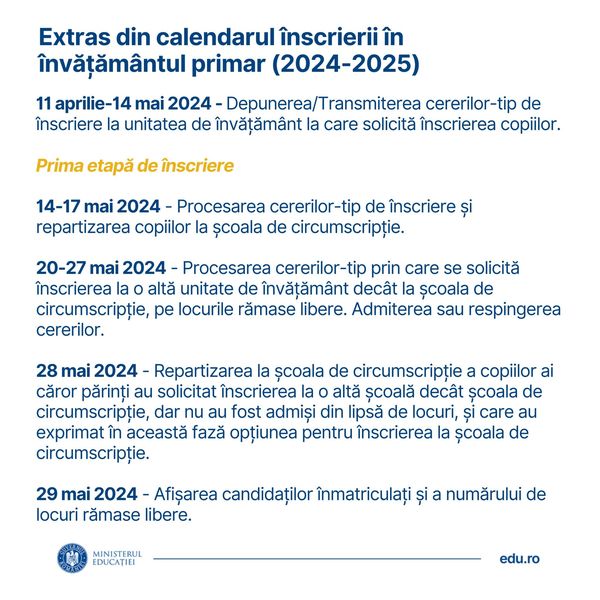 Conform unui extras din calendarul de înscriere, publicat de ministrul educației Ligia Deca, pe social media, prima etapă de înscriere în clasa pregătitoare începe pe 11 aprilie. Întreg calendarul și metodologia au fost trimise către publicare și urmează să apară și în Monitorul Oficial.