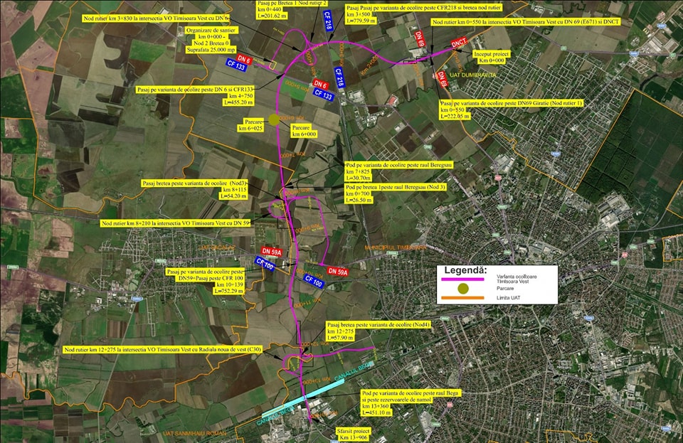 Cristian Pistol, directorul CNAIR, amintește că sunt incluse, printre altel, și construcția a două pasaje – unul peste DN59 și peste linia CF100 (750 m) și un pasaj peste DN6 și linia CF133 (450 m) – și un pod peste râul Bega și peste rezervoarele de nămol (450 m). Acestea ar fi cele ceva mai complicate, pentru că în total vor fi nouă poduri și pasaje. Vor fi și patru noduri rutiere: la intersecția cu DN69 (E671) și cu Drumul Național Centura Timișoara (DNCT): la intersecția cu DN6; la intersecția cu DN59A; la intersecția cu Radiala Nouă de Vest (C30).