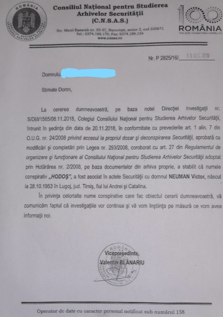 În data de 20 noiembrie 2018, un document oficial al Consiliului Național pentru Studierea Arhivelor Securității a comunicat că numele conspirativ de „Hodoș” a fost asociat în actele Securității cu Victor Neumann.