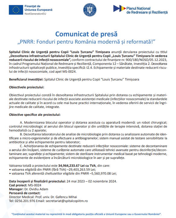 Spitalul Clinic de Urgență pentru Copii “Louis Țurcanu” Timișoara anunță derularea proiectului cu titlul „Dezvoltarea infrastructurii Spitalului Clinic de Urgență pentru Copii „Louis Țurcanu” Timişoara în vederea reducerii riscului de infecții nosocomiale”, conform contractului de finanțare nr. 900/180/NOSO/05.12.2023, în cadrul Programului Național de Redresare și Reziliență, Componenta 12 – Sănătate, Investiția 2. Dezvoltarea infrastructurii spitalicești publice, Investiția specifică: I2.4. Echipamente și materiale destinate reducerii riscului de infecții nosocomiale, cod apel MS-0024.