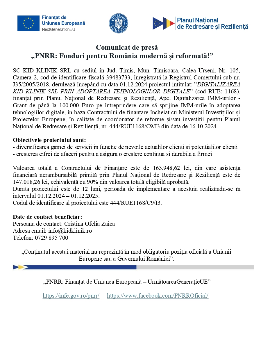 SC KID KLINIK SRL cu sediul în Jud. Timis, Mun. Timisoara, Calea Urseni, Nr. 105, Camera 2, cod de identificare fiscală 39483733, înregistrată la Registrul Comerțului sub nr. J35/2005/2018, derulează începând cu data 01.12.2024 proiectul intitulat: ”DIGITALIZAREA KID KLINIK SRL PRIN ADOPTAREA TEHNOLOGIILOR DIGITALE” (cod RUE: 1168), finanțat prin Planul Național de Redresare și Reziliență, Apel Digitalizarea IMM-urilor – Grant de până la 100.000 Euro pe întreprindere care să sprijine IMM-urile în adoptarea tehnologiilor digitale, în baza Contractului de finanțare încheiat cu Ministerul Investițiilor și Proiectelor Europene, în calitate de coordonator de reforme și/sau investiții pentru Planul Național de Redresare și Reziliență, nr. 444/RUE1168/C9/I3 din data de 16.10.2024.