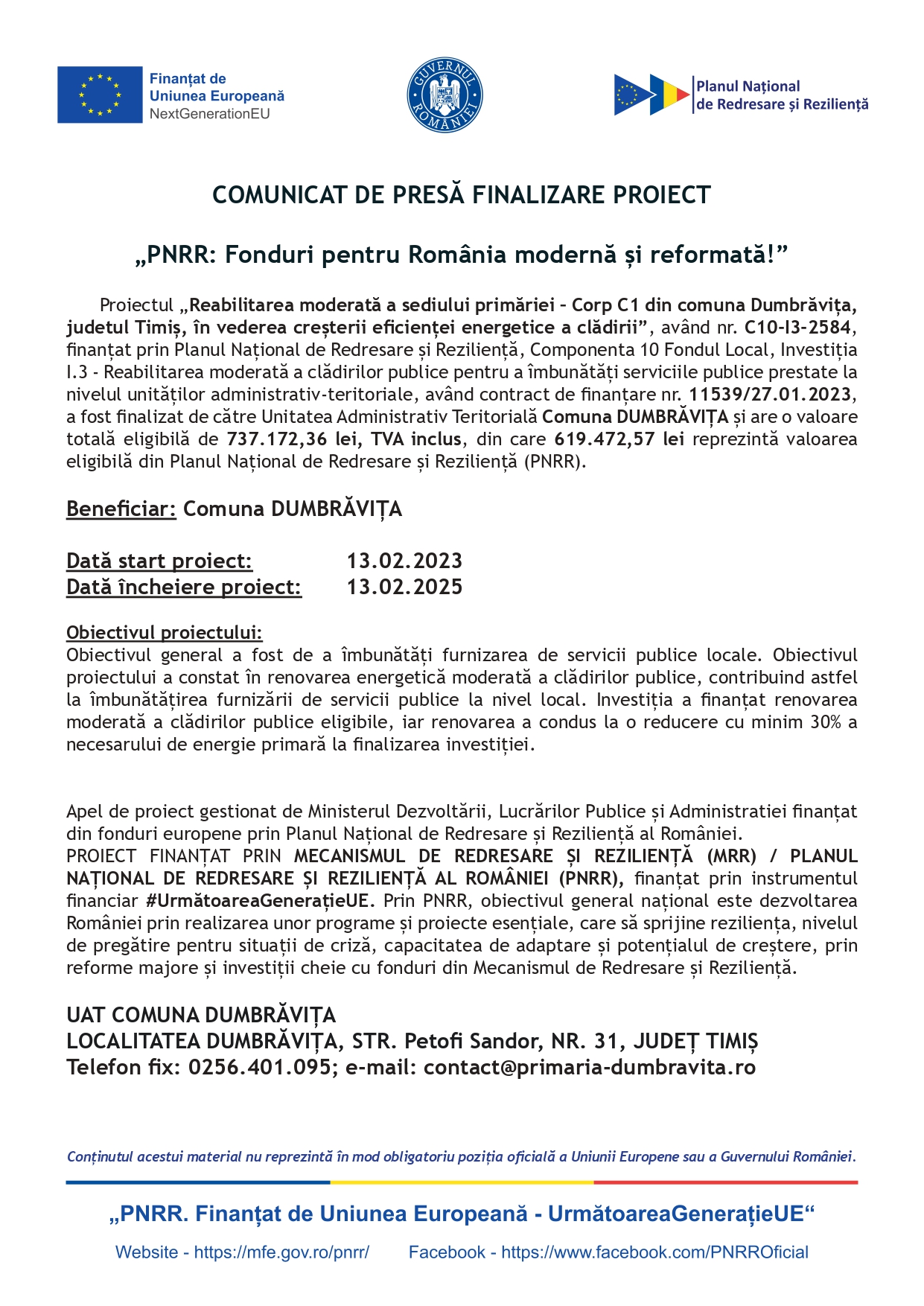 Proiectul „Reabilitarea moderată a sediului primăriei – Corp C1 din comuna Dumbrăvița, județul Timiș, în vederea creșterii eficienței energetice a clădirii”, având nr. C10-I3-2584, finanțat prin Planul Național de Redresare și Reziliență, Componenta 10 Fondul Local, Investiția I.3 – Reabilitarea moderată a clădirilor publice pentru a îmbunătăți serviciile publice prestate la nivelul unităților administrativ-teritoriale, având contract de finanțare nr. 11539/27.01.2023, a fost finalizat de către Unitatea Administrativ Teritorială Comuna DUMBRĂVIȚA și are o valoare totală eligibilă de 737.172,36 lei, TVA inclus, din care 619.472,57 lei reprezintă valoarea eligibilă din Planul Național de Redresare și Reziliență (PNRR).