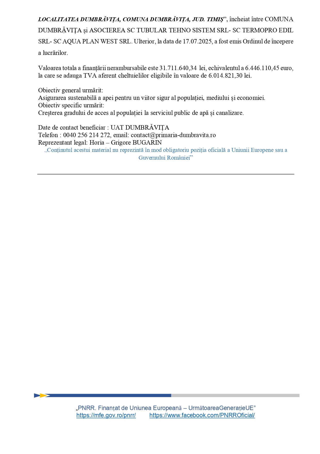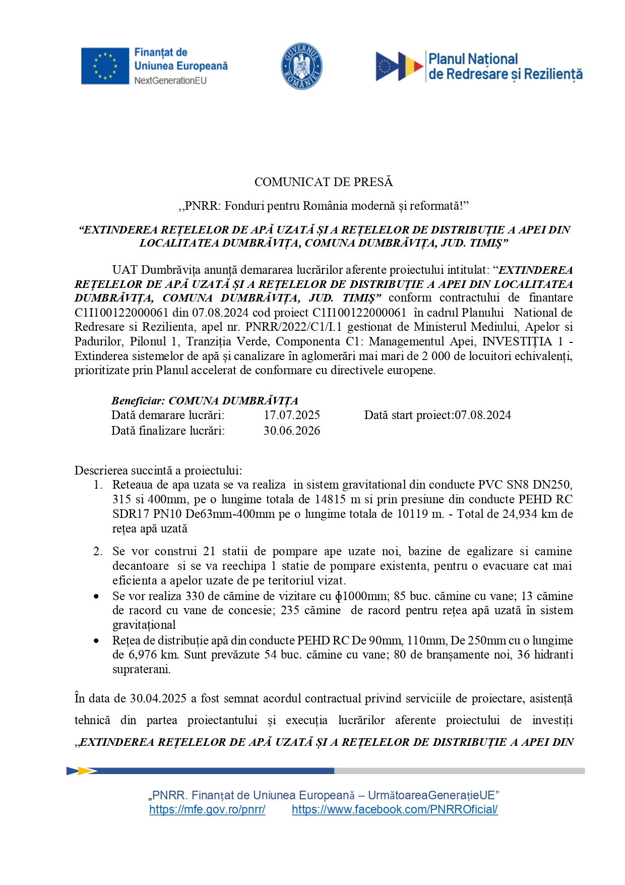 UAT Dumbrăvița anunță demararea lucrărilor aferente proiectului intitulat: “EXTINDEREA REȚELELOR DE APĂ UZATĂ ȘI A REȚELELOR DE DISTRIBUȚIE A APEI DIN LOCALITATEA DUMBRĂVIȚA, COMUNA DUMBRĂVIȚA, JUD. TIMIŞ” conform contractului de finantare C1I100122000061 din 07.08.2024 cod proiect C1I100122000061 în cadrul Planului National de Redresare si Rezilienta, apel nr. PNRR/2022/C1/I.1 gestionat de Ministerul Mediului, Apelor si Padurilor, Pilonul 1, Tranziția Verde, Componenta C1: Managementul Apei, INVESTIȚIA 1 – Extinderea sistemelor de apă și canalizare în aglomerări mai mari de 2 000 de locuitori echivalenți, prioritizate prin Planul accelerat de conformare cu directivele europene.