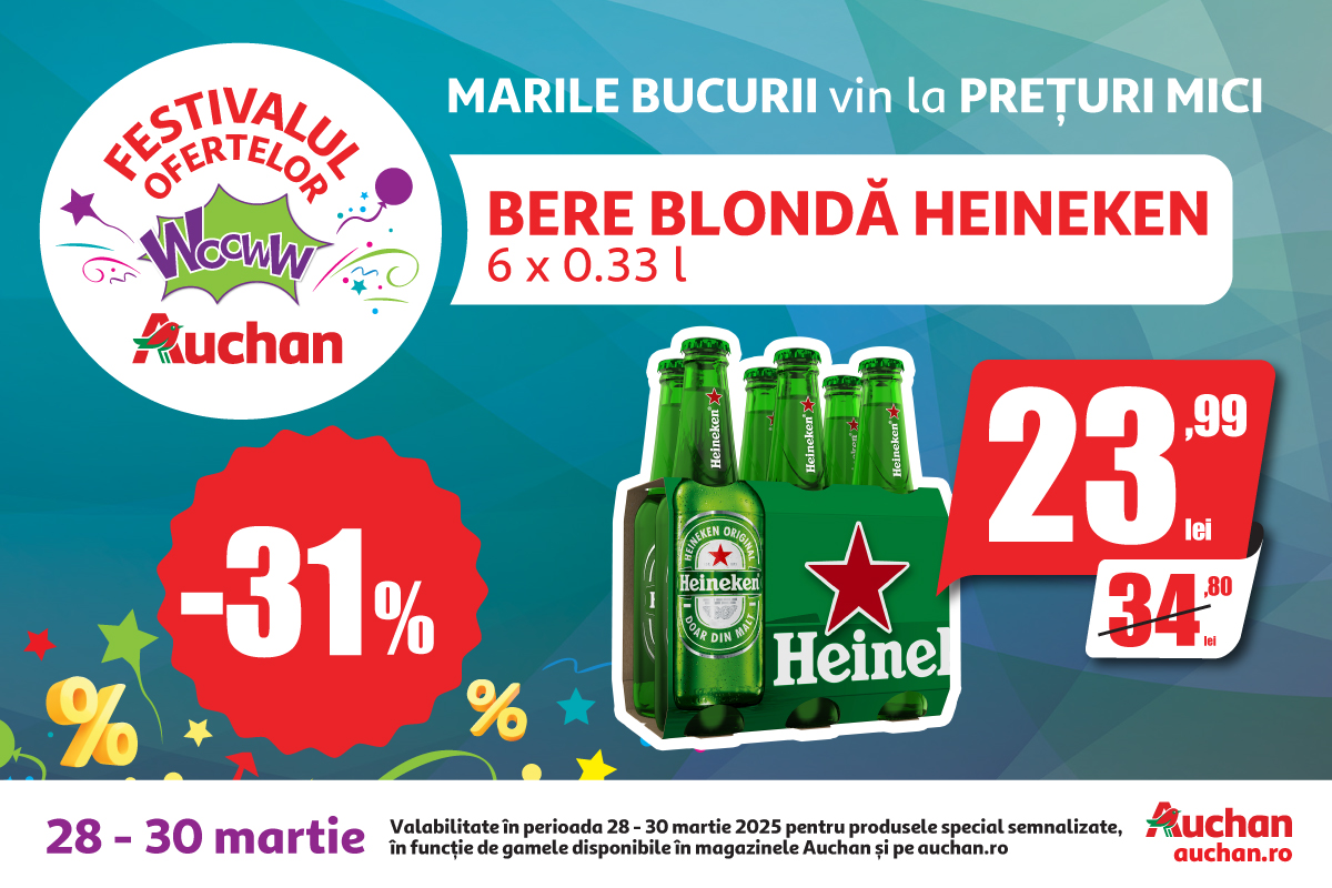 Până pe 1 aprilie, magazinele Auchan te invită la Festivalul Ofertelor Wooww unde poți profita de reduceri de până la 50% la produse importante – fie că este vorba despre produse alimentare sau nealimentare, din categorii precum băcănie, băuturi alcoolice și non-alcoolice, cosmetice, produse de menaj, produse pentru copii, articole pentru animalele de companie, dar și electronice și electrocasnice.
