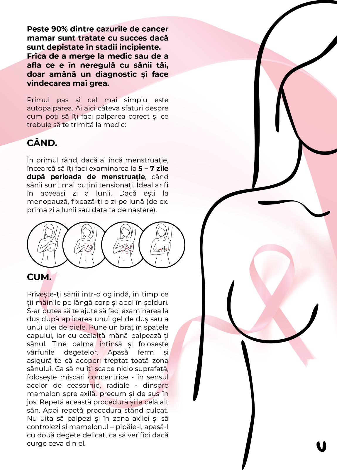 „Un alt pas important în prevenția cancerului de sân este programarea la ecografie (până în 40 de ani) sau la mamografie (după 40 de ani). Această programare ar trebui să fie un obicei firesc, așa cum îți serbezi ziua de naștere, de pildă! Ecografia mamară nu doare, nu este neplăcută, nu este periculoasă, nu este invazivă, nu trebuie să faci pregătiri speciale pentru ea și poate fi cel mai frumos gest de iubire față de tine și cei dragi”, spune Cosmina Grigore, președinta Asociației Imunis.