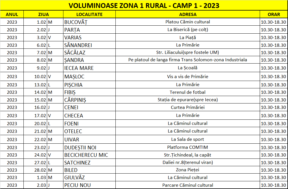 Cetățenii din localităţile menţionate mai sus pot depune prin aport voluntar și gratuit deșeurile voluminoase în containerele special puse la dispoziție în punctele de colectare și între orele menționate în tabelul de mai jos.