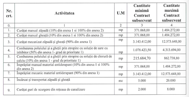 Ce trebuie să facă muncitorii firmei de salubritate? Să curețe manual și mecanizat zăpada și gheața, să stropească cu sare și inhibitor și cu clorură de calciu, să împrăștie manual și mecanic material antiderapant, să încarce și să transporte zăpada și gheața și să curețe gurile de scurgere din rețeaua de canalizare.