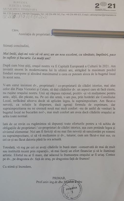 „V-am cerut insistent dv., proprietarii/ co-proprietarii de clădiri istorice, mai ales celor din Piața Victoriei și Cetate, să dați clădirilor dv. un aspect care să facă cinste, nu rușine orașului nostru. Unii ați răspuns rațional, pozitiv – și vă mulțumesc pentru asta –, alții, din păcate, nu. Pe cei din urmă, v-am pus, prin hotărâri ale consiliului local, nefăcând altceva decât să aplicăm legea, la supraimpozitare”, le scrie Robu.