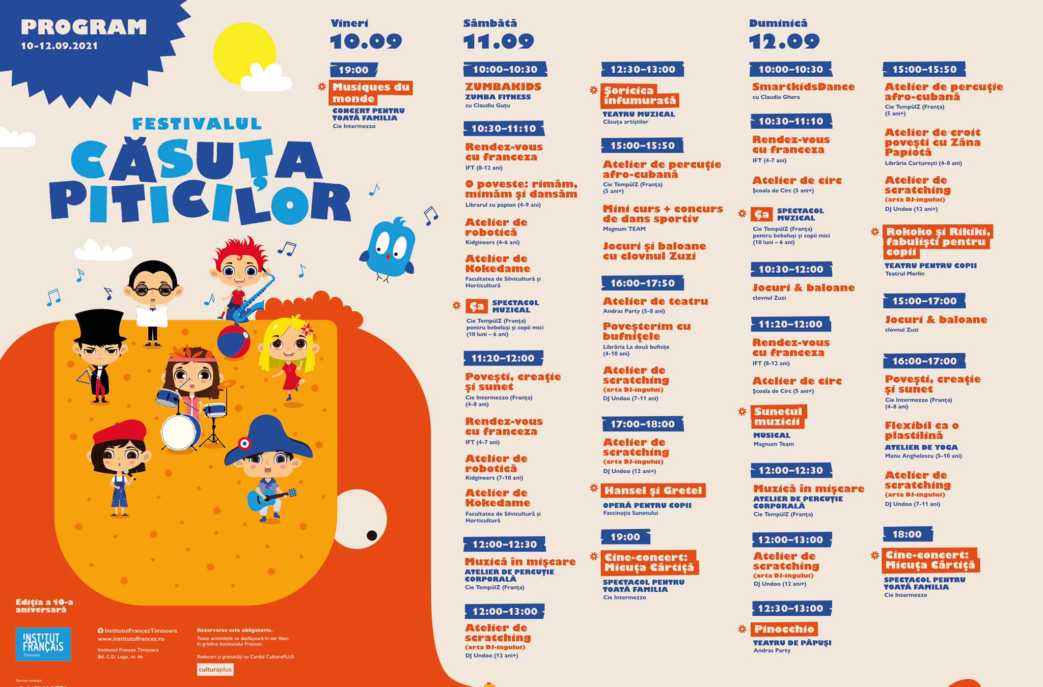 În grădina Institutului Francez din Timișoara se vor organiza evenimente pentru micuți, care debutează vineri, 10 septembrie, până duminică, 12 septembrie. Vineri seară, de la ora 19, va fi un concert pentru întreaga familie – Musiques du monde et percussions – susținut de compania Intermezzo din Franța. Sâmbătă, de la ora 19 și duminică, de la ora 18, participanții sunt așteptați la ciné-concertul Micuța Cârtiță. Spectacolul muzical interactiv Ça va avea loc sâmbătă și dumincă de la ora 10.30 și se adresează în special copiilor cu vârste cuprinse între 10 luni și 6 ani.