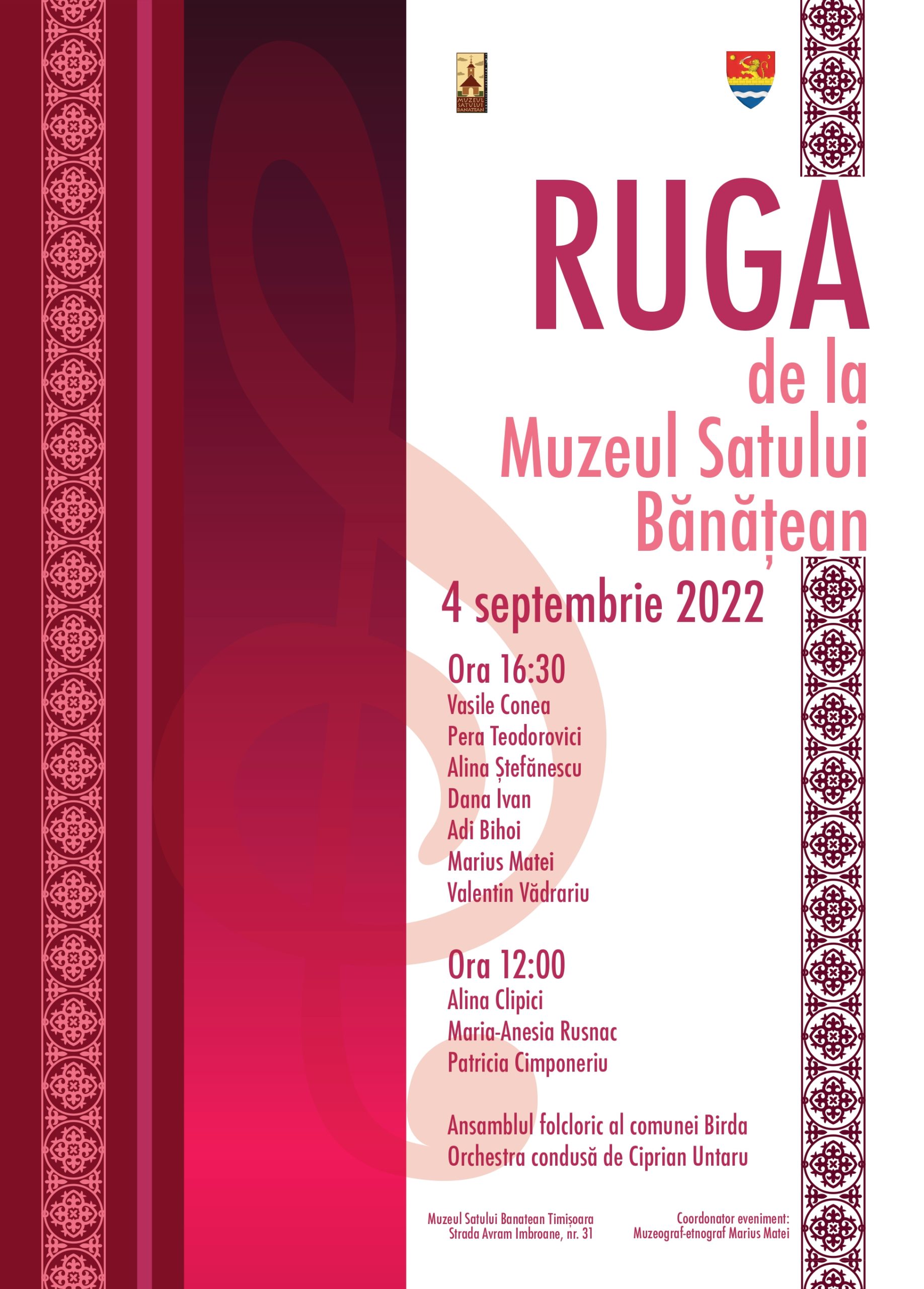 De la ora 16:30 pe scena muzeului vor urca ansambluri de dansuri din Banat și artiști din zonă: Vasile Conea, Pera Todorovici, Alina Ștefănescu, Dana Ivan, Adi Bihoi, Valentin Vădrariu și mulți alții.