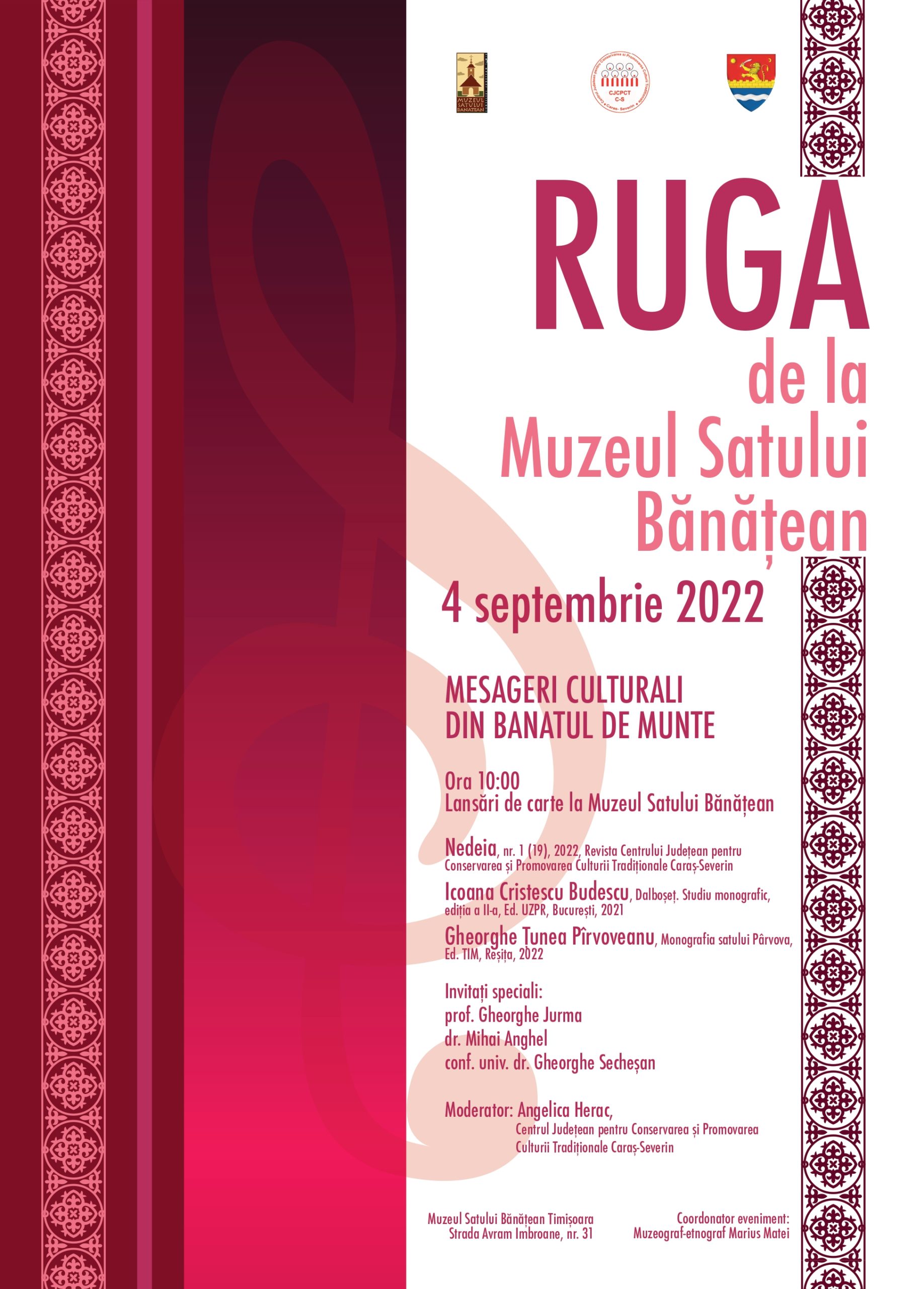 Ruga începe duminică, 4 septembrie, de la ora 10. În prima parte a zilei vor avea loc două prezentări de carte, alături de mai recent număr al revistei Nedeia al Centrului Județean pentru Promovarea și Conservarea Culturii Tradiționale Caraș Severin. Vor participa: prof. Gheorghe Jurma, dr. Mihai Anghel, conf. univ. dr. Gheorghe Secheșan. Întâlnirea va moderată de Angelica Herac.