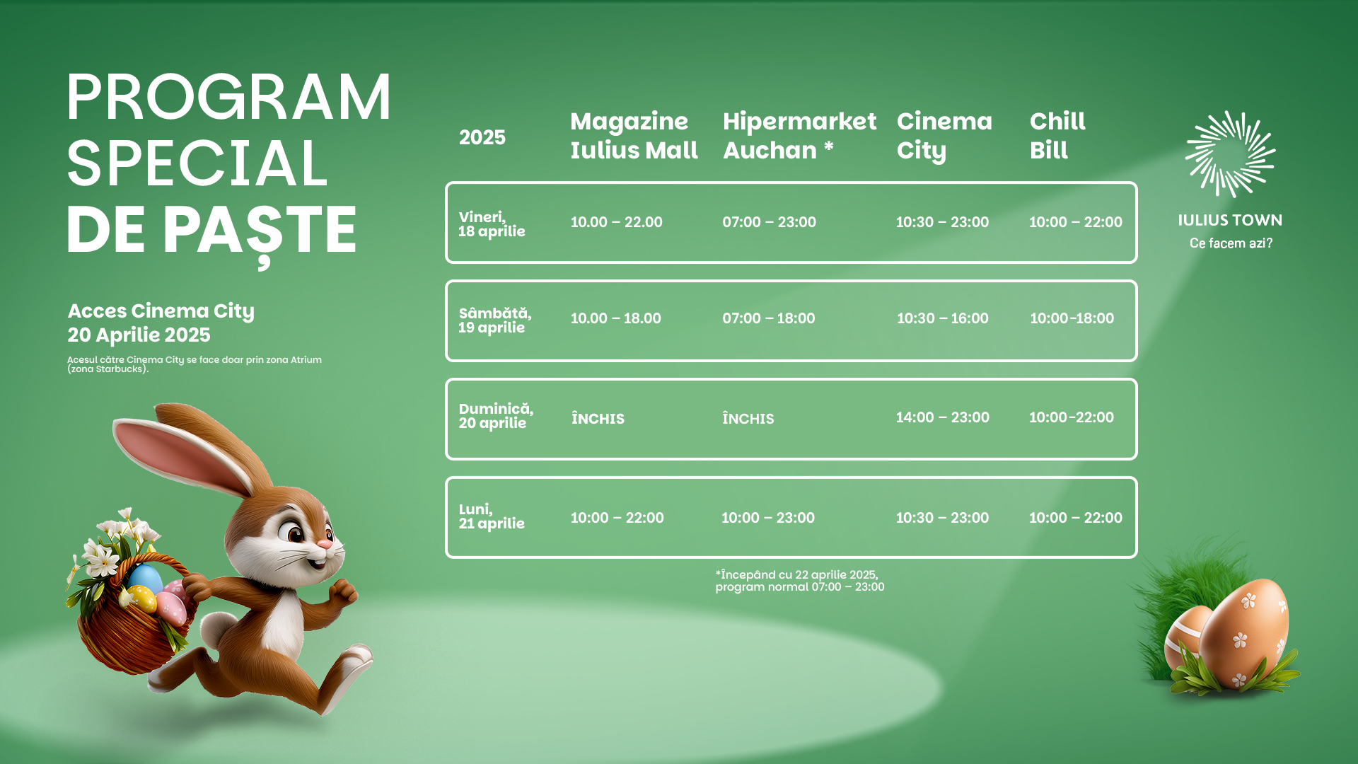 Dacă pregătirile de Paște te prind pe ultima sută de metri, trebuie să știi că locațiile din Iulius Town vor fi deschise sâmbătă, 19 aprilie 2025, între orele 10:00 și 18:00, iar hipermarketul Auchan va funcționa între 07:00 și 18:00. De asemenea, Cinema City va fi deschis sâmbătă, între orele 10:30 și 16:00, iar centrul de divertisment Chill Bill, între 10.00 – 18.00.