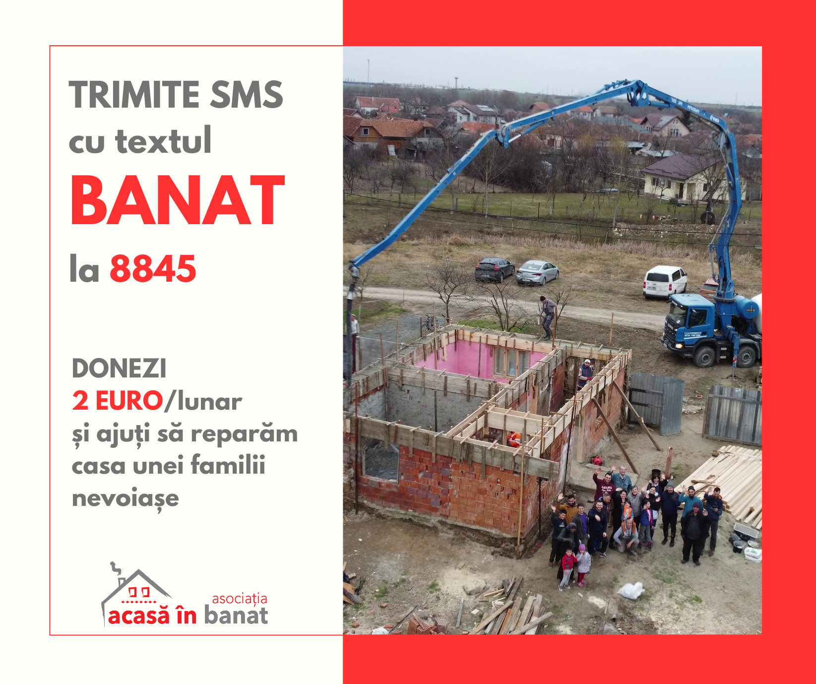 Începând de astăzi, donatorii au la dispoziție cea mai simplă metodă pentru a susține singurul program de repararea caselor dedicate familiilor din Banat: pot trimite un SMS cu textul BANAT la numărul 8845 și vor dona 2 euro lunar (echivalentul a numai 10 lei) pentru a ajuta la construcția și repararea unor locuințe în tot Banatul.