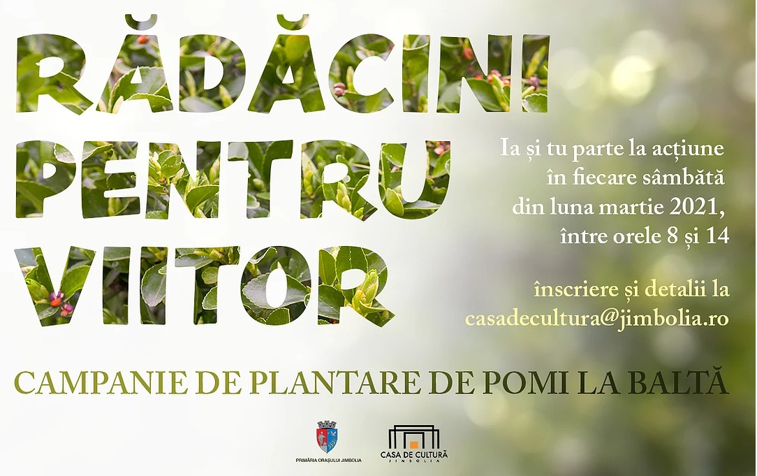 „Rădăcini pentru viitor” propune implicarea cetățenilor pentru a planta pomi la Baltă, spațiu situat în localitatea Jimbolia. Campania este organizată de Casa de Cultura a Orașului Jimbolia împreună cu Primăria Orașului Jimbolia.