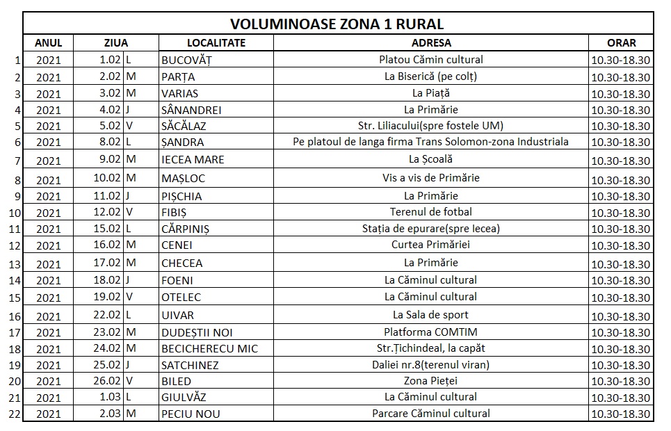 Cetățenii din localităţie menţionate mai sus pot depune prin aport voluntar deșeurile voluminoase în containerele special puse la dispoziție în punctele de colectare și între orele menționate în tabelul de mai jos.