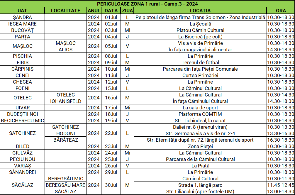 În perioada 01 – 30 iulie 2024 se desfășoară o nouă campanie de colectare gratuită a deșeurilor periculoase din menajer în Zona 1 Rural a judeţului Timiş organizată de RETIM și ADID Timiș, în localitățile Șandra, Iecea Mare, Bucovăț, Parța, Mașloc (și în Alioș), Pișchia, Fibiș Cărpiniș, Cenei, Checea, Foeni, Otelec (și în Iohanisfeld), Uivar, Dudeștii Noi, Becicherecu Mic, Satchinez (și în Hodoni și Bărăteaz), Biled, Giulvăz, Peciu Nou, Variaș, Sânandrei și Săcălaz (și în Beregsău Mic, Beregsău Mare).
