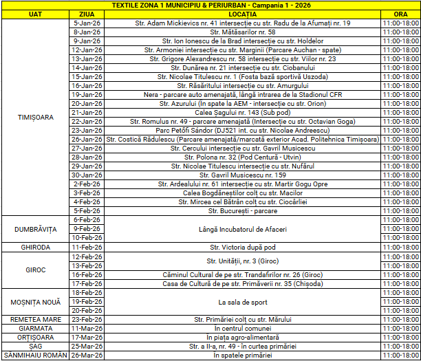 Utilizatorii casnici din localitățile menționate pot preda GRATUIT, prin aport voluntar, deșeurile textile la punctele de colectare stabilite, conform programului din tabelele* de mai jos: