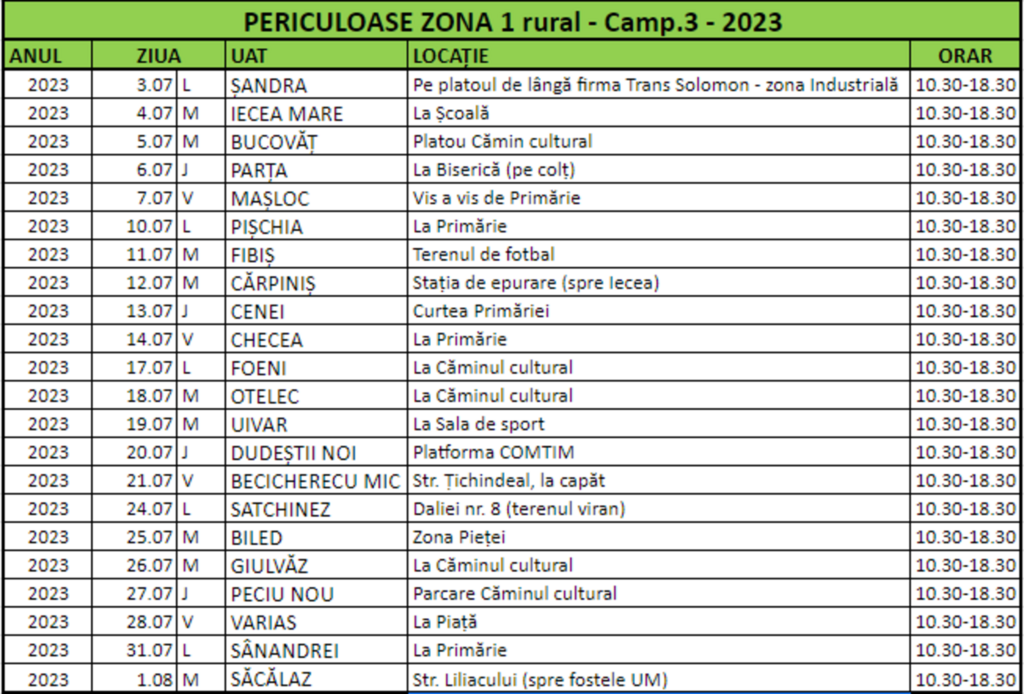 Astfel, în perioada 03 iulie – 01 august 2023 se desfășoară o campanie dedicată colectării deșeurilor periculoase din menajer în Zona 1 rural a judeţului Timiş. Sunt incluse localitățile Șandra, Iecea Mare, Bucovăț, Parța, Mașloc, Pișchia, Fibiș, Cărpiniș, Cenei, Checea, Foeni, Otelec, Uivar, Dudeștii Noi, Becicherecu Mic, Satchinez, Biled, Giulvăz, Peciu Nou, Variaș, Sânandrei, Săcălaz.