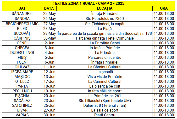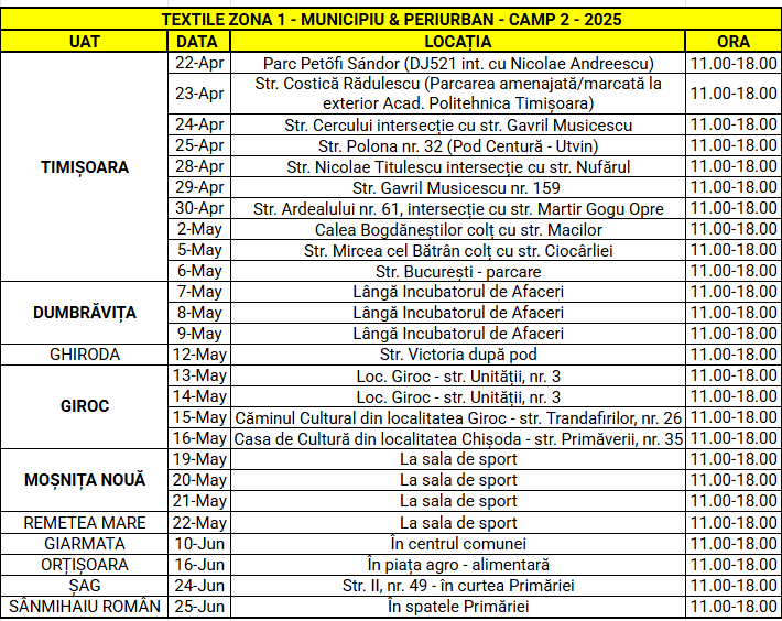 Utilizatorii casnici din localitățile menționate pot preda gratuit, prin aport voluntar, deșeurile textile la punctele de colectare stabilite, conform programului din tabelele de mai jos: