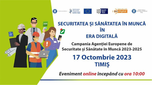 Marți, 17 octombrie, cu ocazia Săptămânii Europene pentru Securitate și Sănătate în Muncă, inspectorii de muncă timișeni organizează un webinar gratuit. În temă cu evenimentul european, acesta este numit „Sănătate și securitate în muncă în era digitală” și va începe la ora 10:00. Acțiunea este organizată, de fapt, de Inspecția Muncii București, prin Inspectoratul Teritorial de Muncă Timiș, în parteneriat cu Universitatea Politehnica Timișoara și Punctul Focal al Agenției Europene pentru Securitate și Sănătate în Muncă.