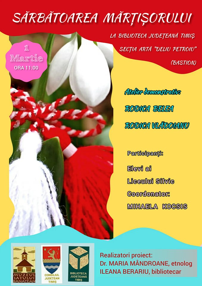 Muzeul Satului Bănățean Timișoara în colaborare cu Biblioteca Județeană Timiș „Sorin Titel”, secția Arte „Deliu Petroiu” instituții de cultură finanțate de Consiliul Judeţean Timiş , organizează marți, 1 martie, de la ora 11 la Bastionul Maria Theresia, „Sărbătoarea Mărțișorului”.