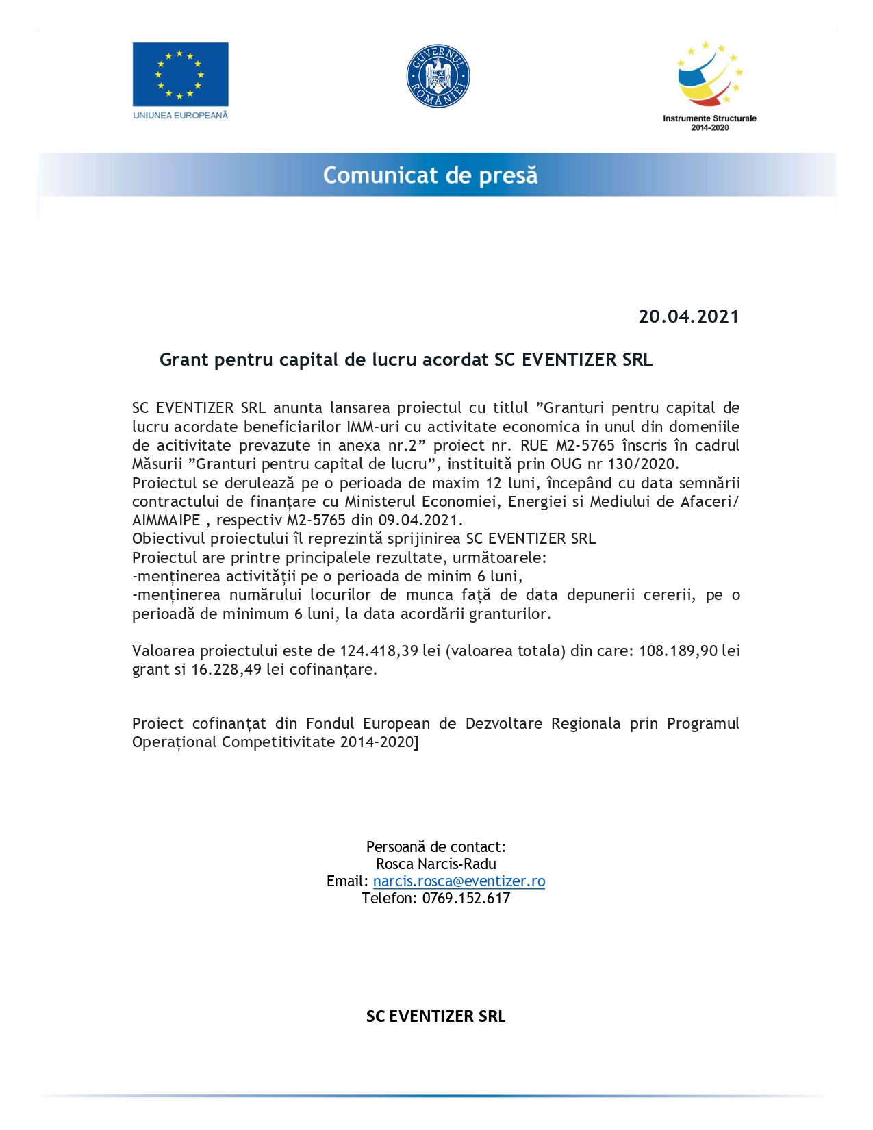 SC EVENTIZER SRL – Grant pentru capital de lucru acordat SC EVENTIZER SRL