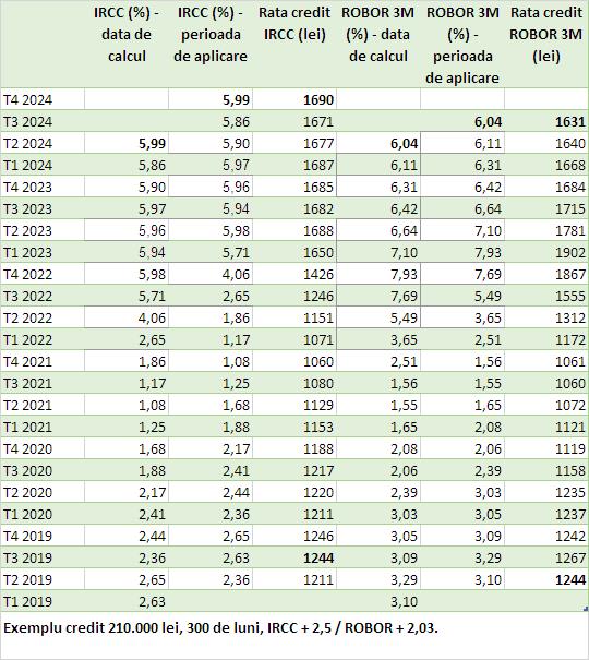 ROBOR pe de altă parte (indice aplicat în principal creditelor în RON Prima Casă, acordate înainte de 2019) a ajuns la aproape 8% după ce a fost la un nivel de peste 7% trei trimestre consecutive. Băncile pot avea în vedere fie valoarea ROBOR la o anumită dată atunci când fac calculul ratelor creditelor acordate, fie pot să facă o medie a acestui indice pe o anumită perioadă și să ia în calcul acest nivel. Această practică poate varia de la o bancă la alta, spre deosebire de aplicarea IRCC (utilizat în principal pentru creditele imobiliare/ipotecare și pentru creditele de consum) care este unitară pentru toate Băncile.