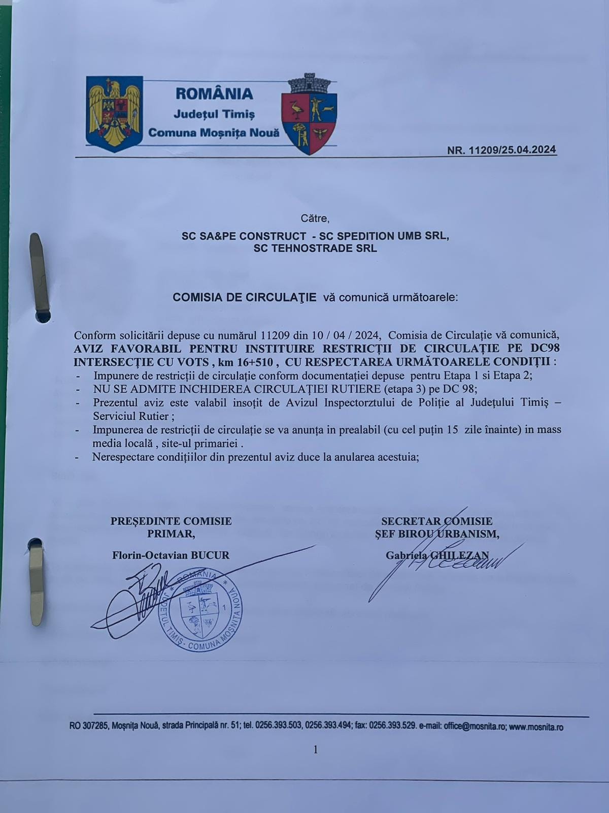 „Antreprenorul a depus documentația pentru avize în urmă cu mai bine de o lună, dar Primăria Moșnița Nouă a respins acordarea avizului pentru instituirea restricțiilor rutiere. S-a propus apoi o alta varianta cu o bretea de circulație, în 23 mai, însă primăria nu a dat răspuns. Antreprenorul are certificat de urbanism, acordurile necesare. Există inclusiv un aviz al primarului cu acordul său pentru varianta aleasă de intersecție cu virare obligatorie la dreapta pe centură”, au explicat reprezentanții DRDP Timișoara, pentru Tion.