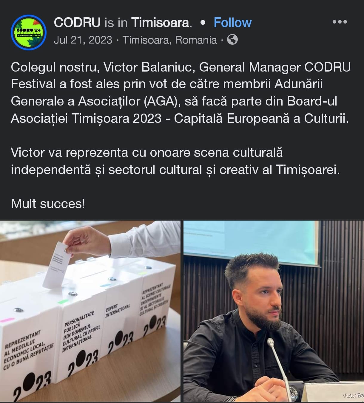 Victor Bălăniuc, General Manager CODRU, cel care reprezintă „cu onoare scena culturală independentă și sectorul cultural și creativ al Timișoarei” și care are firma Balvia Development SRL, a fost implicat și în anularea Festivalului Luminii, care ar fi trebuit să aibă loc în noaptea de Revelion.