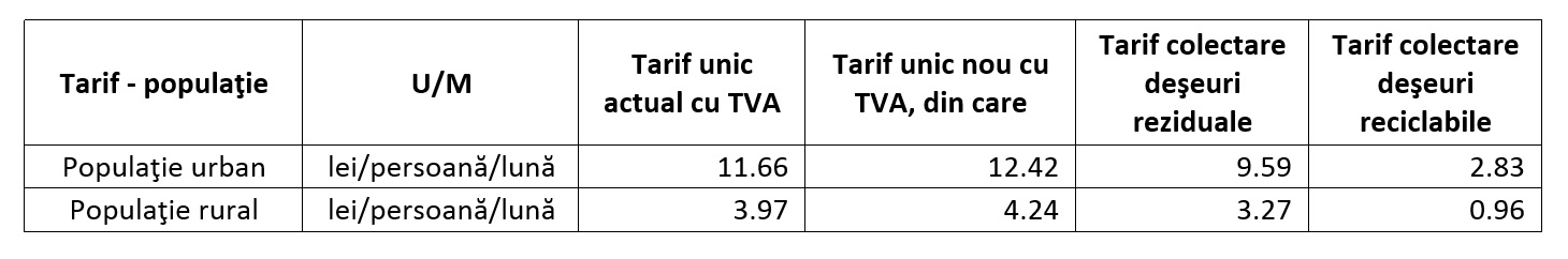 Tarifele aplicabile pentru întreaga Zonă 1 Timiş vor fi: