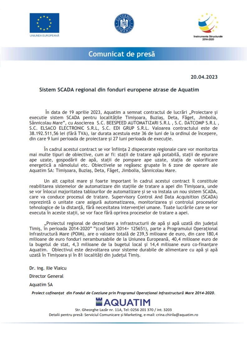 În data de 19 aprilie 2023, Aquatim a semnat contractul de lucrări „Proiectare și executie sistem SCADA pentru localităţile Timişoara, Buziaş, Deta, Făget, Jimbolia, Sânnicolau Mare”, cu Asocierea S.C. BEESPEED AUTOMATIZARI S.R.L , S.C. DATCOMP S.R.L , S.C. ELSACO ELECTRONIC S.R.L, S.C. EDI GRUP S.R.L. Valoarea contractului este de 38.192.511,56 lei (fără TVA), iar durata acestuia este 36 de luni de la ordinul de începere, din care 9 luni perioada de proiectare și 27 luni perioada de execuţie.