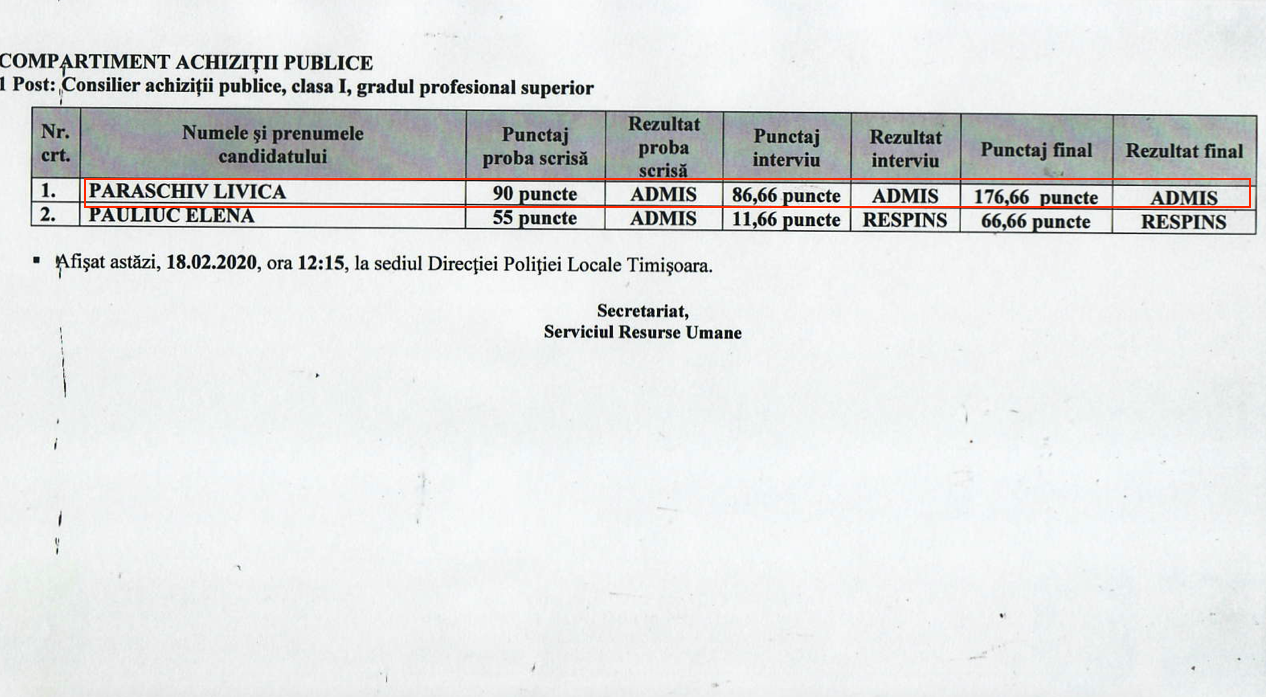Poliția Locală a organizat în perioada 6-14 februarie un concurs de angajare pentru mai multe compartimente și servicii. Pentru Achiziții Publice a fost nevoie de un consilier achiziții publice, clasa I, gradul profesional superior. Condițiile de înscriere erau următoarele: studii universitare de licență absolvite cu diplomă de licență sau echivalentă în domeniul științelor economice și o vechime de șapte ani. Nu se cereau cunoștințe de utilizare a calculatorului și nici cunoașterea vreunei limbi străine.