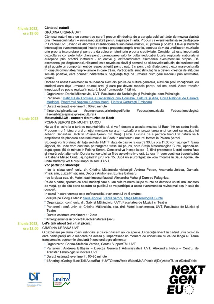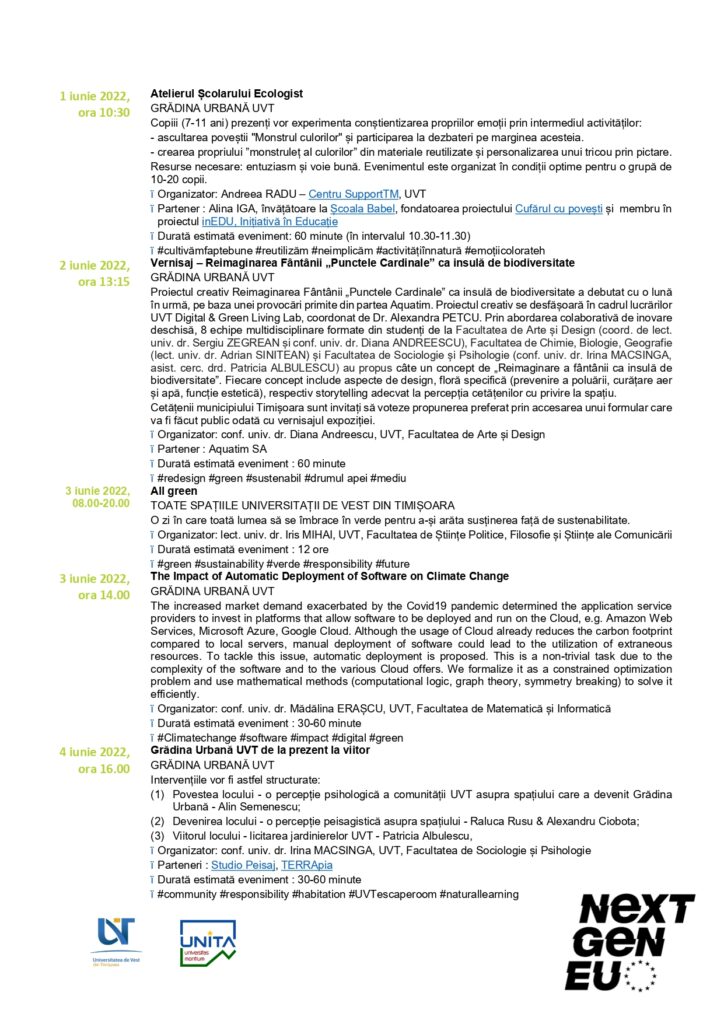 Programul de anul acesta a fost propus integral de membri ai comunității UVT: studenți, personal academic sau administrativ. Evenimentele au fost apoi supuse votului participativ. Puteți consulta agenda Săptămânii Verzi Europene la UVT și să fiți parte a evenimentului prin completarea acestui formular.