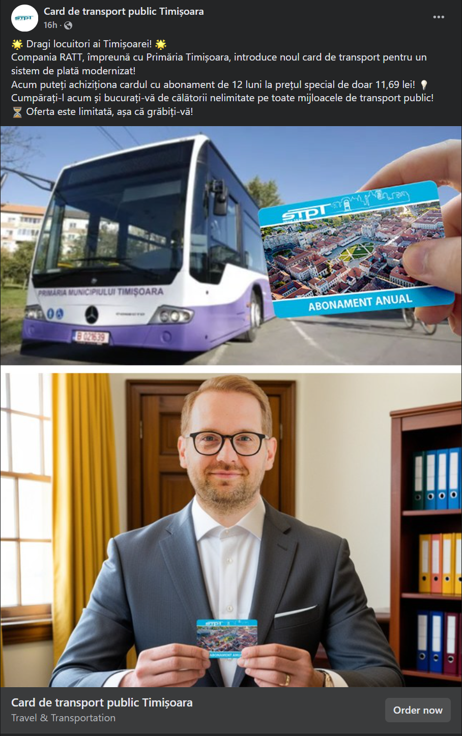 Cea mai recentă înșelătorie este promovată pe pagina de Facebook „Card de transport public Timișoarа”. Aici, se vorbește de „noul card de transport pentru un sistem de plată modernizat”. Abonamentul fictiv pe 12 luni se vinde „la prețul special de doar 11,69 lei!”.
