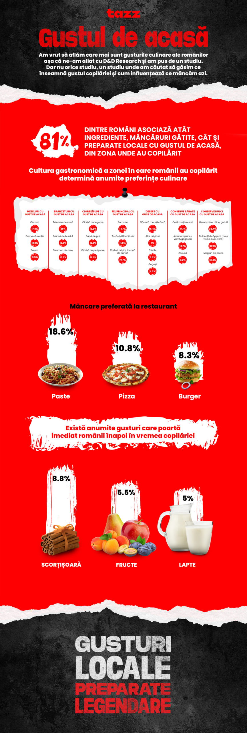 Gustul de acasă, conturat pe baza studiului, devine așadar busola unei noi categorii de produse lansate în premieră în România de tazz: ”Gusturi locale, preparate legendare” – o colecție de peste 2000 de noi preparate, bazate pe cele mai populare produse internaționale și reinventate de chefi cu ingrediente locale, exclusiv pentru tazz.