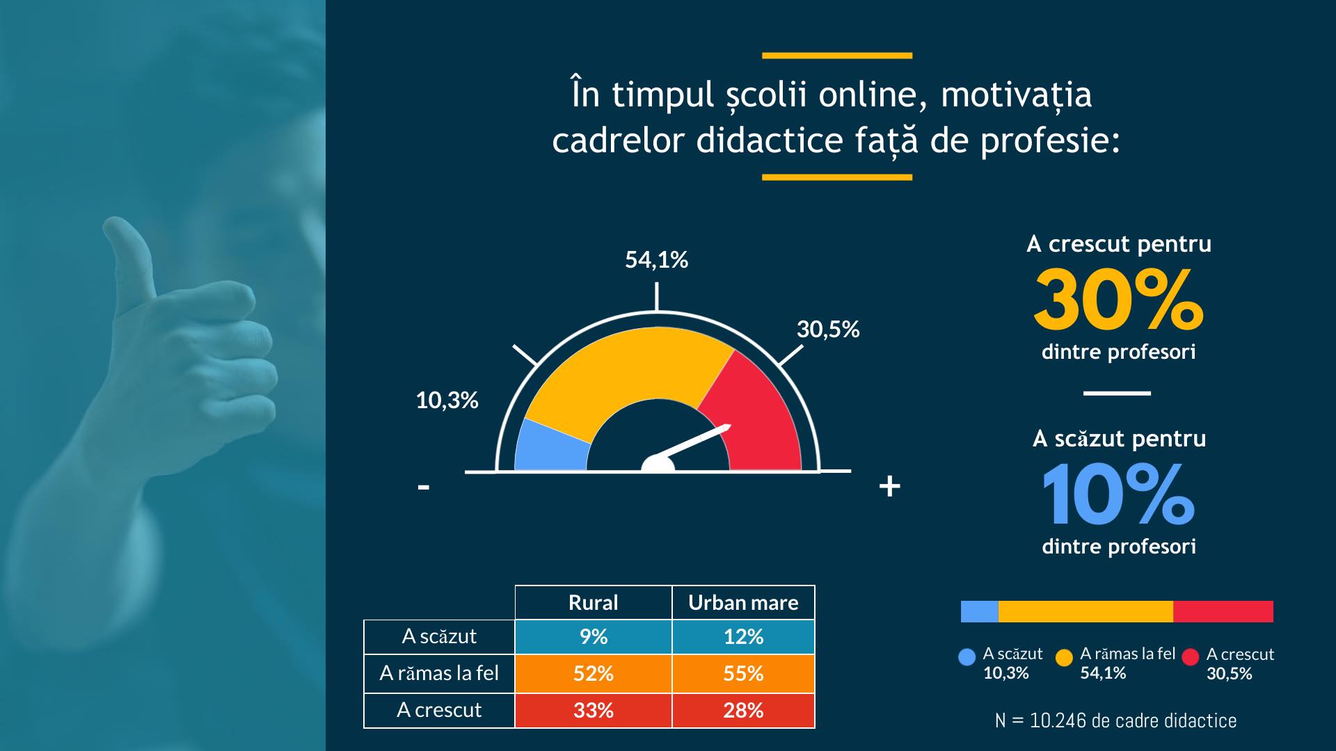 „Majoritatea cadrelor didactice au căutat în această perioadă să găsească cele mai bune modalități de lucru și nu s-au mulțumit să urmeze doar deciziile «centrale». Este o perspectivă care este potențată și de un alt item, în care pentru mai mult de jumătate dintre cei chestionați motivația pentru cariera didactică a rămas constantă în această perioadă, pentru 30,5% a crescut și doar pentru 10 procente dintre cei întrebați în cercetare această motivație a scăzut. Aceștia au dat dovadă nu doar de creativitate și adaptabilitate, ci și de implicare în împingerea înainte unui proces care părea că ar putea să se blocheze. Așa cum bănuiam, corpul profesoral rămâne coloana vertebrală a oricărei schimbări sociale”, spune Ovidiu Pânișoară, directorul Departamentului pentru Formarea Profesorilor de la Universitatea din București.