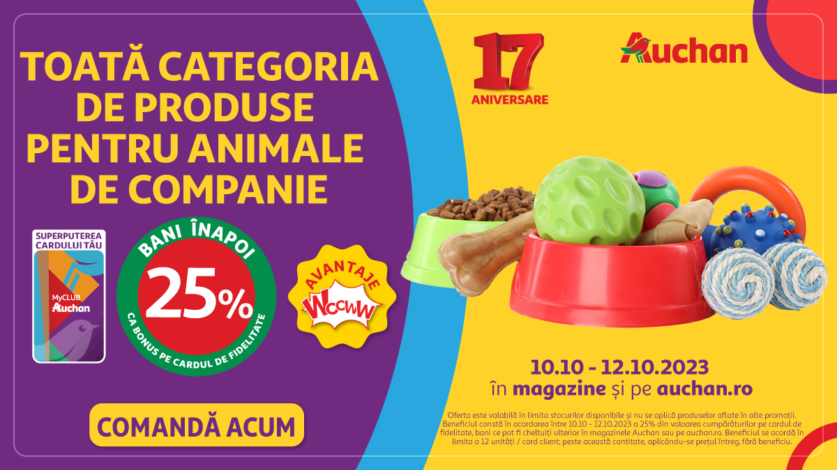 În plus, dacă ești membru MyCLUB Auchan, te bucuri de un beneficiu special: 25% bani înapoi ca bonus pe cardul de fidelitate la toată categoria de produse pentru animale de companie. Până pe 24 octombrie ești așteptat în magazinele Auchan, precum și pe auchan.ro, să descoperi sute de oferte promoționale și beneficii speciale!