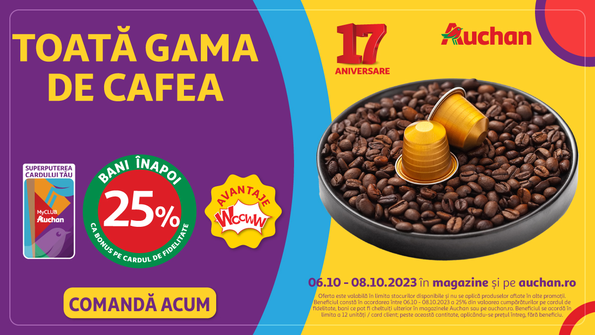 În plus, dacă ești membru MyCLUB Auchan, te bucuri de un beneficiu special: 25% bani înapoi ca bonus pe cardul de fidelitate la toată gama de cafea.