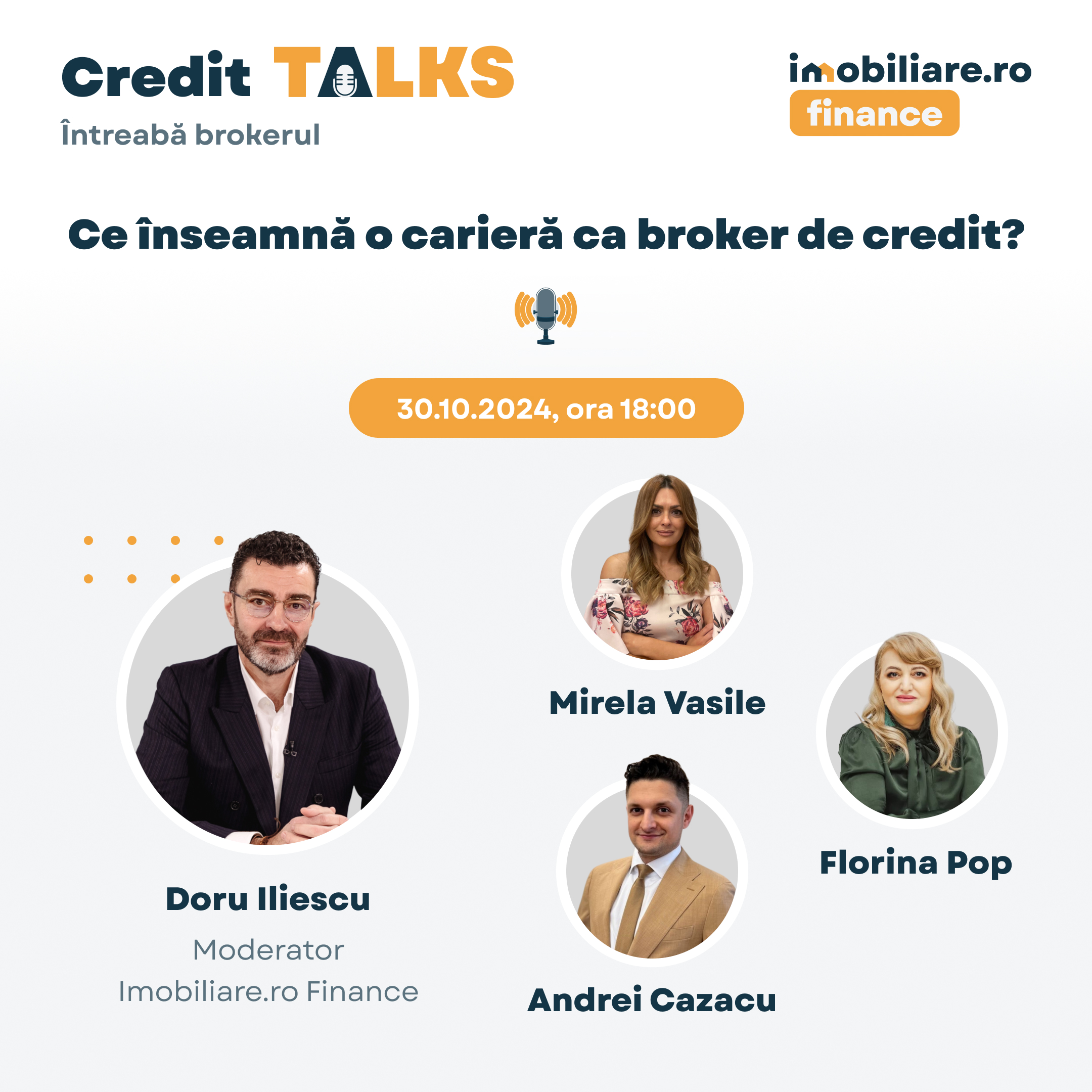 Webinarul „Credit Talks” va fi organizat pe 30 octombrie, începând cu ora 18. Înscrierile sunt gratuite și pot fi făcute aici. Acesta se adresează atât tinerilor absolvenți de Finanțe-Bănci și profesioniștilor în vânzări sau agenților imobiliari care caută o nouă direcție pentru a-și extinde portofoliul de servicii, cât și persoanelor care au deja experiență în domeniul bancar și vor să exploreze noi provocări.