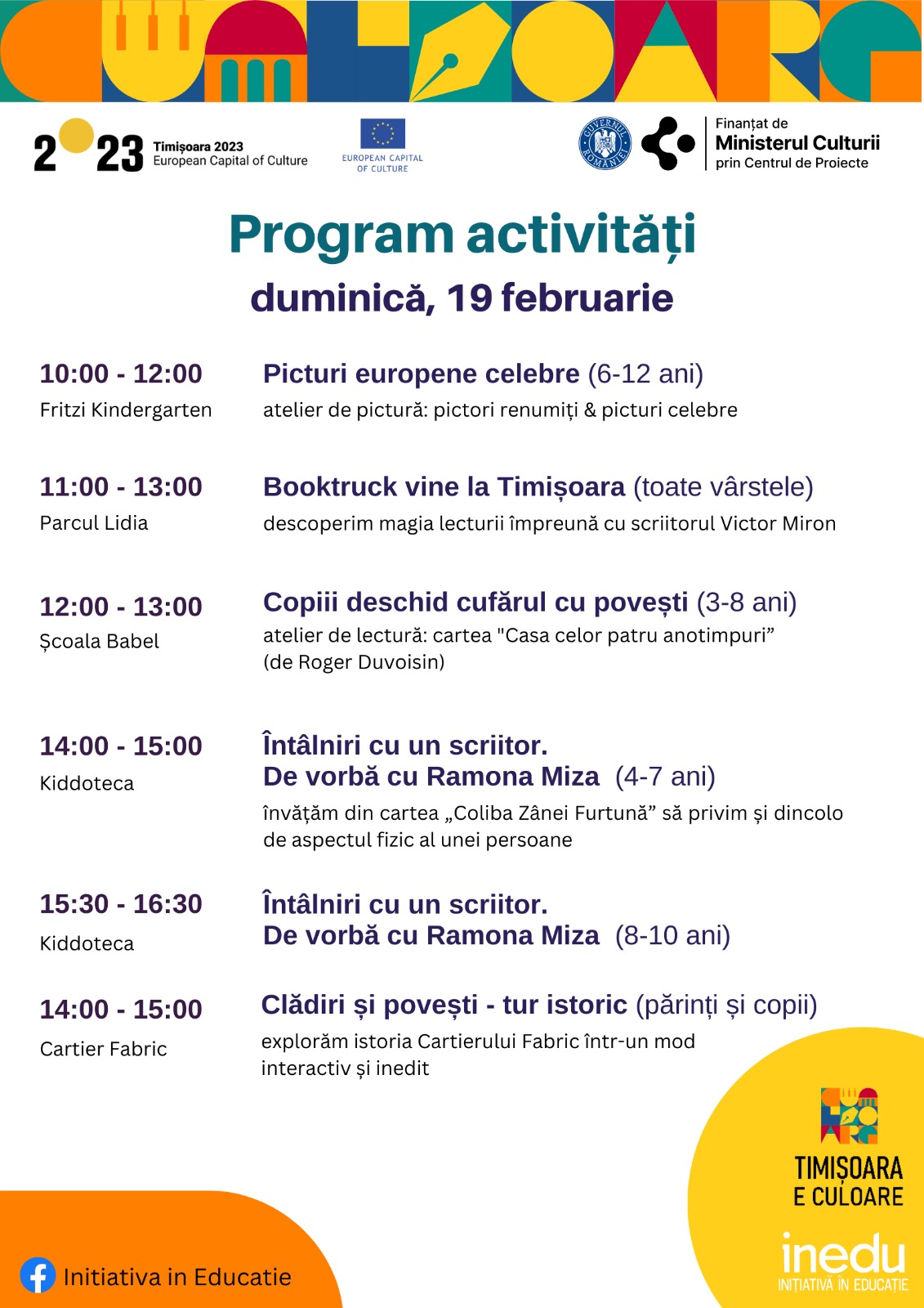 În perioada 17-19 februarie, când are loc deschiderea programului Timișoara – Capitală Europeană a Culturii, copiii sunt invitați de către Asociația Inițiativă în Educație să coloreze orașul. Timp de trei zile, în mai multe cartiere vor avea loc activități educaționale, culturale și artistice. Participarea este gratuită.