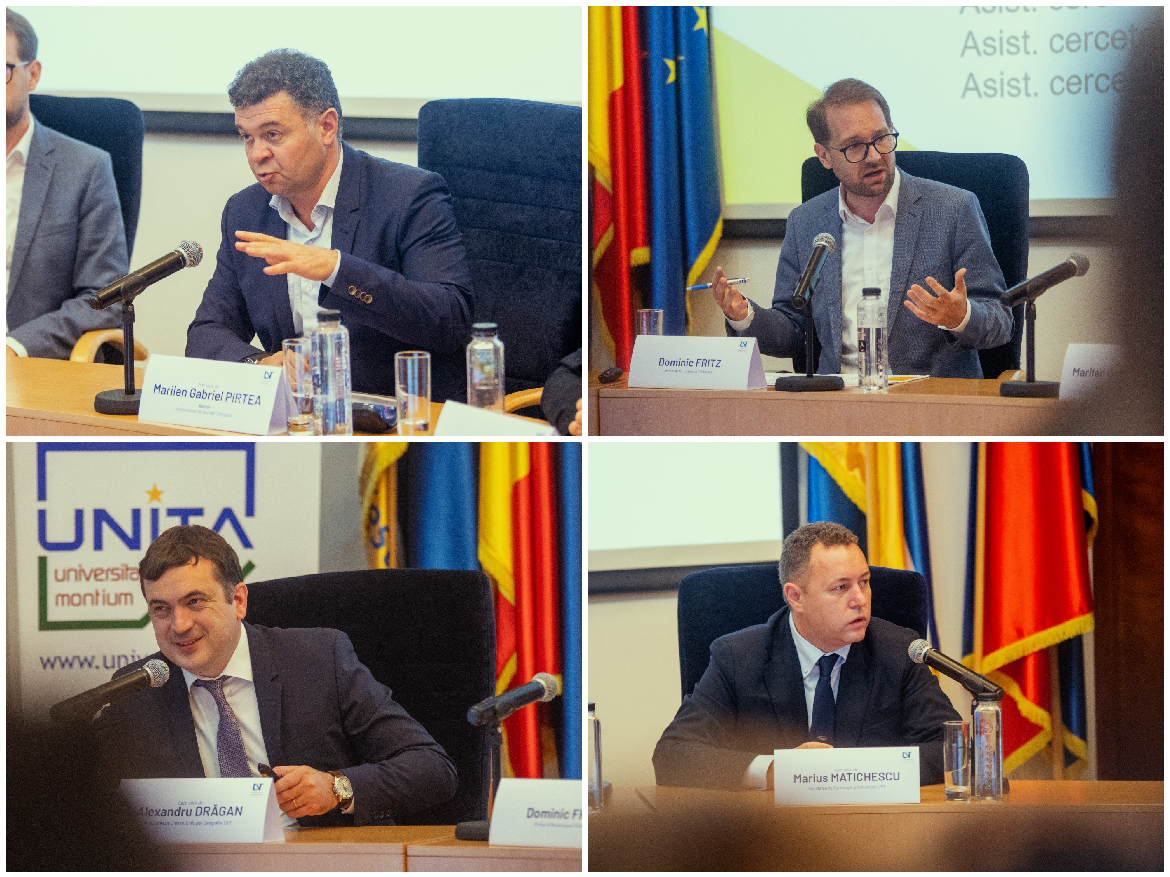 La conferință au participat rectorul UVT Marilen Gabriel Pirtea, primarul Timișoarei Dominic Fritz și coordonatorii studiului, universitarii Marius Matichescu și Alexandru Drăgan.