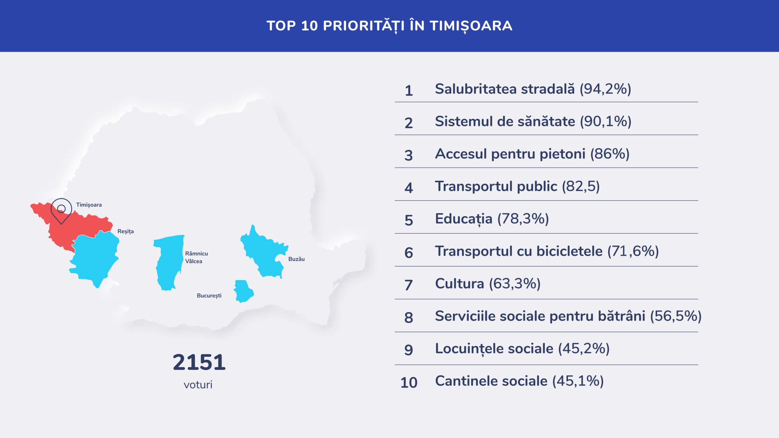 „Timișorenii sunt nemulțumiți și foarte nemulțumiți de cum abordează Primăria Timișoara sănătatea, salubritatea stradală, transportul public și accesul pentru pietoni. Ele au o importanță mare, dar satisfacția față de felul în care tratează primăria temele acestea este mică, așadar concluzia în urma sondajului de opinie este că aceste patru priorități trebuie urgentate.