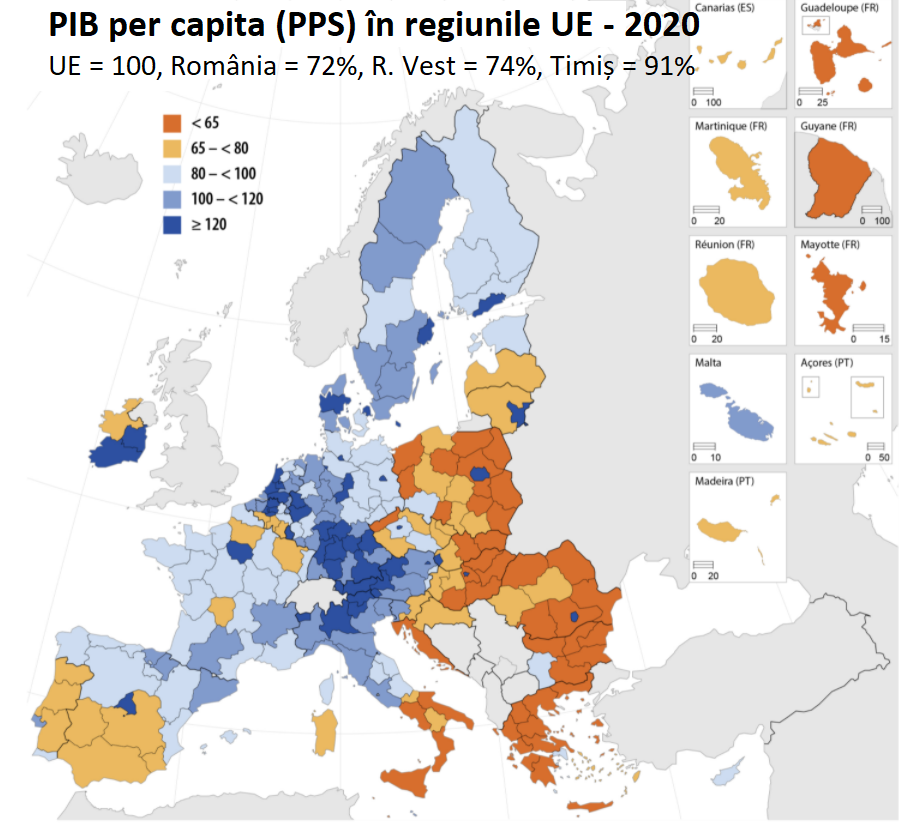 Conform raportului prezentat de CJ Timiș, județul are un PIB per locuitor de 91% din media UE. De asemenea, PIB-ul pe anul 2021 al județului Timiș a fost de 55,5 miliarde de lei, jumătate din PIB-ul regiunii de vest.