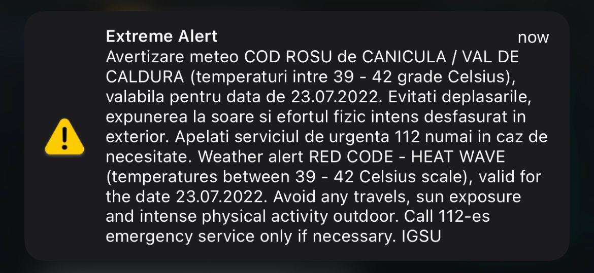 „În data de 23.07.2022 ora 10.00 în urma primirii AVERTIZĂRII Meteo COD ROȘU de CANICULĂ/VAL de căldură cu numărul 83 de la Centrul Meteorologic Banat-Crișana, la nivelul Inspectoratului Pentru Situații de Urgență «Banat» al județului Timiș, au fost dispuse următoarele măsuri principale:– au fost înștiințate U.A.T vizate de codul ROȘU pentru punerea în aplicare a măsurilor proprii prevăzute de planurile in vigoare în astfel de situații de urgență, precum si alte autorități cu atribuții in domeniul situațiilor de urgență.– ca măsuri suplimentare s-a dispus ridicarea nivelului de operaționalizare a tehnicii din dotare, specifică tipurilor de risc posibile în urma avertizării meteorologice primite. De asemenea IGSU a emis mesaje RO-Alert pentru U.A.T vizate de avertizări”, spun cei de la ISU Timiș.
