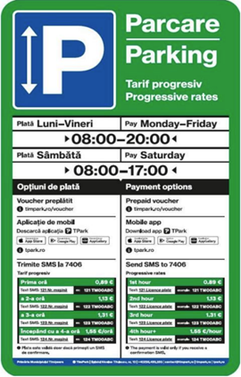 Toate aceste informații se regăsesc și pe panourile ce delimitează zonele de parcare din sistemul Timpark.