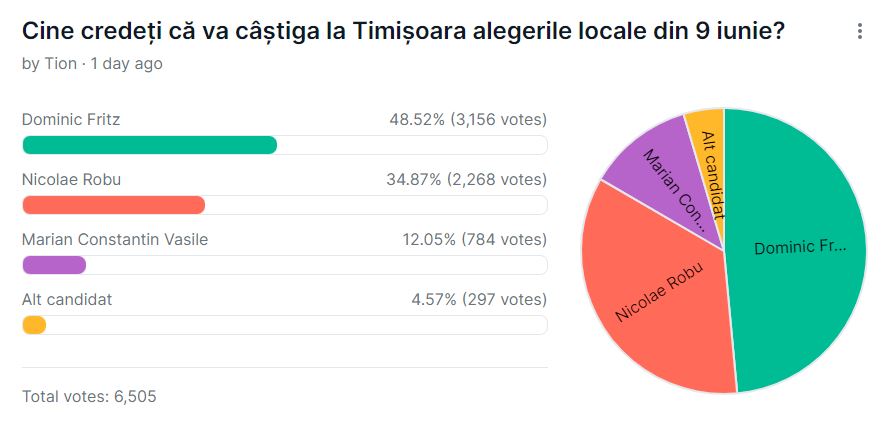 Sondajul Tion s-a încheiat. La întrebarea „Cine credeți că va câștiga la Timișoara alegerile locale din 9 iunie?” au răspuns 6.505 cititori. Dintre aceștia, 3.156 cred că Dominic Fritz va câștiga alegerile locale din 9 iunie. Alți 2.268 de cititori cred că acestea vor fi câștigate de Nicolae Robu. 784 de utilizatori cred că Marian Constantin Vasile va fi cel care va câștiga, în timp ce restul mizează pe un alt candidat.